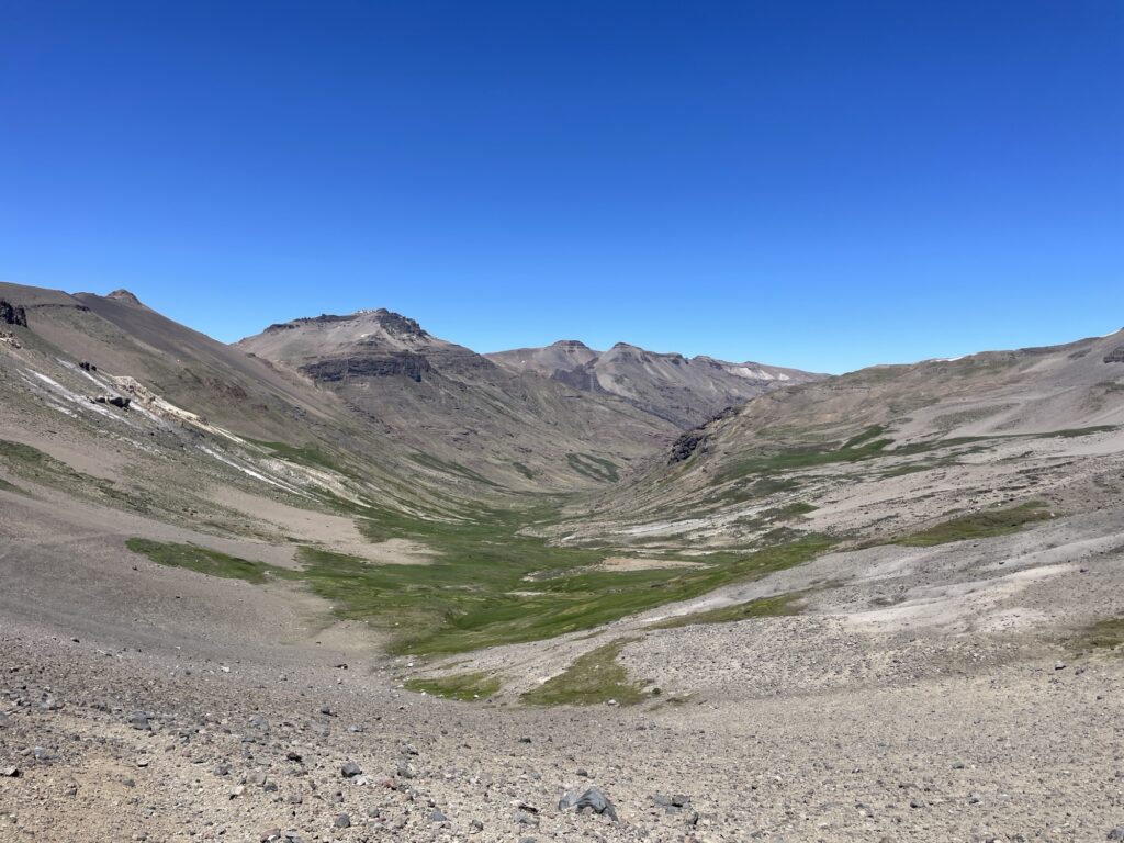 I continue hiking on the regular route, I climb, go down, climb, go down, and climb one last time, and go down one last time, or sliding on my but, the sand and stones was really loose. I’m now in another large and long valley that I will follow for a long time. The view from where I entered the valley reminds me a bit of Rapadalen in Sarek, Sweden.