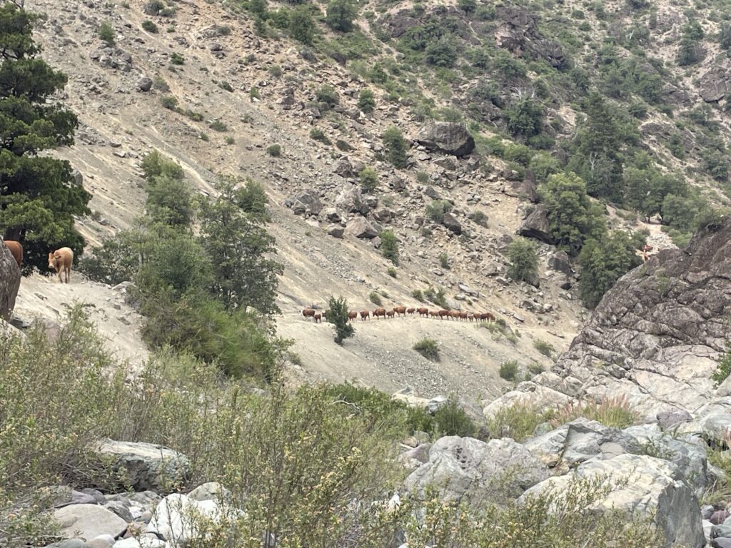 After a while the valley narrows, and the trail now runs along the slopes. It is relatively nice hiking, with the major disadvantage that the narrow trail creates several choke points, and the herding continues. At one point, I had to wait 1 hour, not exaggeration, I timed it, as a thousand or so cows were passing by. It looks cool though, with the ever so happy dogs running around casually herding a thousand cows on narrow and steep paths.